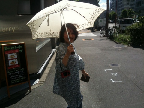 しかもそんな、小花柄のシャツにレーシーな日傘で。