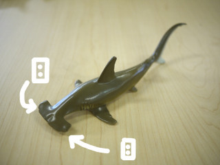 その3 投稿やレポートの合間をぬってお気に入りの「サメ・フィギュア」を一体づつ紹介していく、このコーナー。 第3弾は、へんなサメの代名詞、シュモクザメです。 この人、このトンカチみたいな顔の端っこと端っこに、左右の目がついているんですよ? なんでこんなカタチしてんだ‥‥。 進化の過程で、こういうカタチになる方が有利だったとサメ博士・仲谷先生は言ってました。 下から見ると、すげーっ! 仲谷先生に訊いた『鮫のおはなし。』は こちらから。 写真を提供してくださったのはネコ・パブリッシングさんから出ている 『世界サメ図鑑』です。 2010/08/06 19:49 |