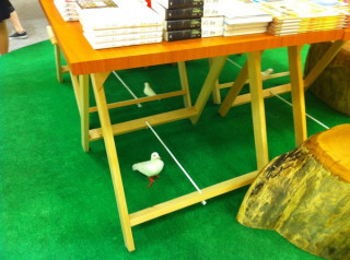 京都ロフト1階にあるほぼ日ストア京都出張所の書籍を積んであるテーブルの下には3羽の白いハトがいるぞ。