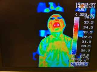ほほう、メガネの部分は温度が低く、開けた口のところは温度が高くうつるわけやね。