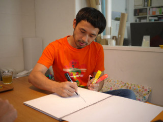 いってきやした。 「はらよわ男のハラマキづくり。」 取材に行ってきました。 再び、マンガ家・タナカカツキさんです。 毎度のことながら、おもしろトーク炸裂でペンとスケッチを持ち、ハラマキづくりの話はもちろん、脱線もありつつ、最近こってらっしゃる 「ご趣味」の話もありつつでした。 あ、そうそう、タナカさんといえば、 「味写」の天久さんとの共著 『バカドリル』の新刊が発売されました! 『バカドリルミニマル』と 『新しいバカドリル リンゴ』です。 こーこ、これは、読まねばーーーーっ! はらよわ男の連載は、不定期ではありますが、まだまだ続きますよー。 この取材の模様は近々更新予定ですので、どうぞおたのしみに〜。 2010/08/24 17:44 |
