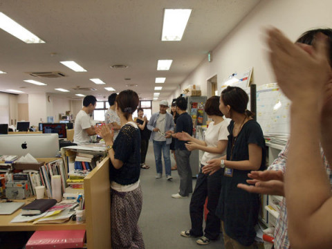 干支が回ってきた男 さて、こちらは本日の全員ミーティングのひと幕です。 フロアの奥のほうから、おもむろに バースデーメガネを手にやってくるのは、 パラ、パラ、パラ‥‥ いくつになってもうれしいたんじょうび、みんなからばらばらの拍手をもらいます。 「いえーい!」 ぼうしをうしろに回した捨て身のピース姿に若干、女子らが引き気味ですが、それはそれ、おとうさん、おいくつになられましたか! 「48です!」 てことは‥‥‥ 「次の干支では還暦です!」 山下の50代というのは、とてもたのしみな気がします。 いやいや、まだあとすこしは40代。 おめでとう、山下さん。 2010/08/30 15:22 |