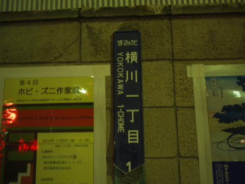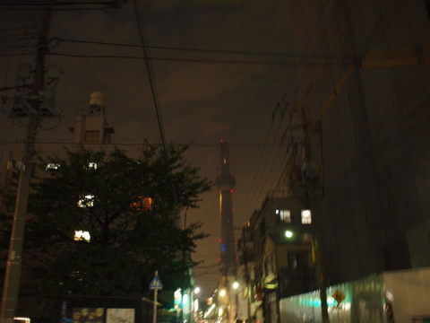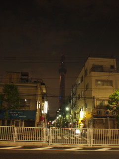 横川1丁目 スカイツリーはよく見えているから、よもや私でも道に迷うことはないだろう‥‥と、歩き始めて15分くらい。 なんと、道をさえぎるものが出現。 遠回りするのは気乗りしないけど、さらにがんばって歩いて10分ちょい、横川というところにつきました。 スカイツリーの青い光がちらりと見えます。 ちょっと左よりに北上すれば、もう少しよく見えるかも。 そんなわけで、てくてく。 けっこう歩いた気がするけど、スカイツリーが近づいている気がしません。 ちらほら、見物している方もふえてきました。 2010/10/13 21:21 |