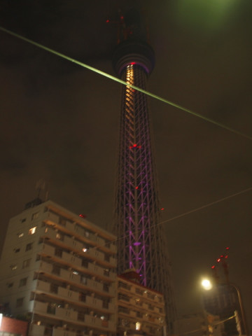 業平橋近くです 読者のかたからメールをいただきました。 __________スカイツリーを会社(神田)の屋上から見てみましたが、光り具合はイマイチ確認できませんでした。 近くじゃないとわかんないっぽいですねぇ。 光るのは第一展望台の根元あたり、という情報がありましたので、そのへんを見てみてください。 頑張ってくださーい! __________ はげましと、アドバイスをありがとうございます! 元気が出ました。 ならば、根元をめざして‥‥と、業平橋近くまで行ってきました。 むらさき色のライトでおおわれてました。 もしかすると、このくらいの距離から見たほうが、まんべんなくきれいに見えるかも。 (写真が暗くてごめんなさい) 完成したら634メートル。 あと100メートル以上、高くなります。 完成してライトアップされる日がたのしみです〜。 2010/10/13 21:41 |