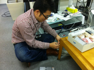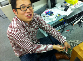 ケーブル・ガイ。 ベイちゃんが、テレビ前ユニオンであぐらをかいてなにかしてるなあとおもったら、彼の大好物、ケーブルと格闘していました。 「このケーブルね、 中継のときに使うやつなんですけど、 この赤いの、みえますか? これが、どうも調子がわるいんですよ。 で、いま横着して、 テレビのスピーカーを使って 実験中。」 どのへんが横着なのか、微妙に私はわからないのですが、えーつまり、なんか中継機材で確認しないといけないのかなあ。 とにかく、ケーブルを修理中ということでした。 ケーブルとベイちゃんの笑顔の組み合わせはまことになごみますね。 2010/10/15 13:58 |
