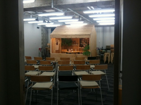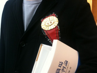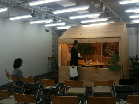 小屋。 見覚えのないこの小屋。 小屋の立っている場所は、見慣れたいつもの大ホールでございます。 小屋を建てたのはもちろん、弊社の山口工務店です。 今回も、なかなか大胆に、大きくいきましたね〜。 今日はこれから、このセットの中で社員が見学させていただき、公開対談が行われます。 お相手は、あの、とある、涙もろいあの方です。 社長のお胸に光っているのは、sunuiさん作の、カンカンバッヂ。 お誕生日プレゼントにくっついていました。 うらやましーっ! 2010/11/11 16:47 |