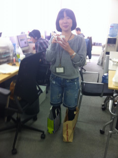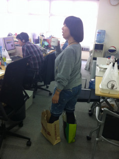 あたらしい履物。 きのう菅野さんは、いわゆる 「バーン・アラウンド」状態でした。 弊社でいうところの、 「バーン・アラウンド」とは 「ヤキがまわった状態」のことを指します。 昨日、菅野さんのおお仕事は、社長とゲストのインタビューの立会いやらセッティングがありました。 かなりバーンアラウンドさせる原因です。 さらに、自分のブーツを 「衣装」として貸し出していたのです。 「なんや、その間に はくもんがないわ。」 といって、おもむろに紙袋を履き、社内を闊歩しはじめました。 私は、きらいじゃないけど、その新しい履物は。 2010/11/12 11:13 |