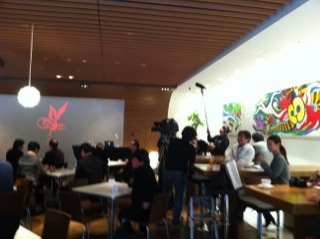 カフェで記者会見っておしゃれじゃないですか、太郎さん、と思いながら開始を待っています。