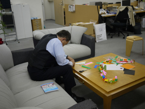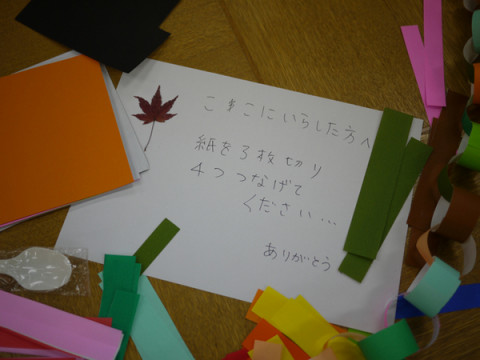 きらいじゃない。 テレビ前ユニオンで、 ちょっと、さみしそう? くるりとまわってみると、さみしそうどころか、とても、たのしんでいるところでした。 けっこう、きらいじゃない様子です。 今週いらっしゃるお客様をお迎えするための装飾作りをみんなに協力をしてもらっているのです。 この調子でいけば、すごくすぐできちゃいそうです。 わたしが 彼女のことを撮ろうとしたら、シャイなので、すごいスピードでいってしまいました。 まるで、小動物のよう。 でも、 あせりすぎたのか、きみの使っていたのり、ふたが完全に開いてたよ。 どんまい。 2010/11/22 17:21 |