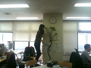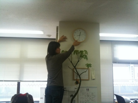 電波をひろった。 弊社の時計は、それぞれに少しずつズレていたりして、基本的に信頼されていません。 そんな中 「電波をひろったで」 と言って (仏頂面総務と呼ばれています)で近づいてきました。 それは、「電波」というものじゃないよ。 「時計」というものだよ? 「ちゃうわ! これ、電波時計やねん」 あ、そっかそっか。 そう言いながら、壁にかけてくれました。 ありがとう。 みんなで時計の水平を確認していたら、 「こっちらか見たらまっすぐだよ」 と、まったく信用出来ない意見を言っていたことも添えさせていただきます。 2010/11/26 12:54 |