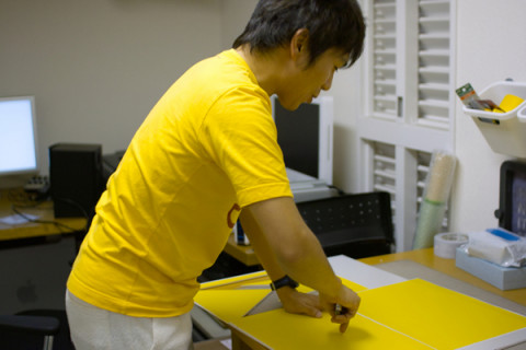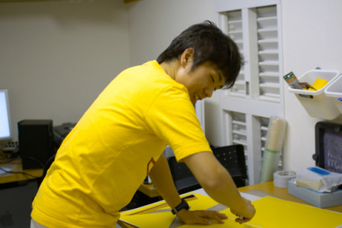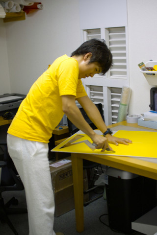 黄色と白の男が。 工作室前を通りかかったら中がなんだかまぶしい。 そこにはまぶしい男がいました。 なにしているの。 「はっ、黄色と白の男が 黄色と白の工作をしております」 そうか、黄色と白の男が黄色と白の工作をしているんだね? なんだかハルキ・ムラカミ的なんだけど。 で、それは何に使うの? 「ムーンライダーズのライブの 装飾をつくっております」 あと数時間後の、あのライブの! ほんとだ、Mの字を切り抜いてる。 あせってる? 「はっ、少々」 デザイナーとしてはなかなかスリリングな仕事ですね。 がんばって〜。たのしみ〜。 2010/11/30 16:17 |