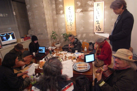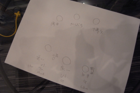 セットチェンジのあいだ、和室楽屋ではムーンライダーズのみなさんがリハに向けてのリハ中。