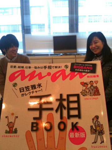 リーディング! ananの手相ムック本が好調なマーコさん。 今日は毎年恒例の 「ほぼ日手帳リーディング」に来てくださいました〜。 マーコさんは、手相だけじゃないのです。 手帳も、Tシャツもリーディングしてくださいます。 リーディング担当 何かというと‥‥今をときめく韓流アイドルBIGBANG。 BIGBANGの手相解説が読めるのは、この本だけでしょうね。 わたしも後で、じっくり読んでみようと思います。 ではマーコさん、長丁場よろしくおねがいします〜。 2010/12/01 15:34 |