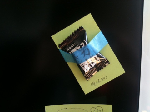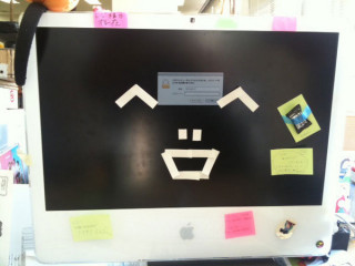 脅迫状!? 朝、出社するとわたしのパソコンのディスプレイになにやら脅迫状のようなものが‥‥サスペーーーーンス! ではなく、昨晩、ふわふわした冬の服用のイラストを描いて、 これはそのお礼のメッセージのようです。 気持ちをストレートに表せない不器用なひとだなぁ。 いや、不器用というか、器用です。 付箋を利用しているようで、使わなかった部分も、おまけのように机の上に置いてありました。 (本人曰く、鼻の未使用部分だそう) 原稿料に飴ちゃんも。 ど、どうもありがとう。 朝からびっくりしたよ。 2010/12/02 11:53 |