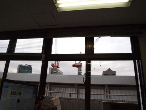 もうすぐお別れの風景 青山は、いま雨があがったようです。 窓から見えるとなりの建物のクレーンが日々姿を変えているのですが、もうすぐ我々はお引越しをするのです。 (近くだけど) ‥‥‥‥と、ちょっぴりセンチメンタルしているととなり席の どうやら、画面の数字と書類の数字のつきあわせ確認をしているようです。 話しかけたいそぶりの乗組員が背後に迫っても、その影すら認識しません。 この「月に何度か集中する男」山根とも引っ越しによる席替えでお別れとなります。 2010/12/14 12:08 |