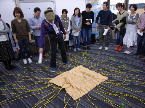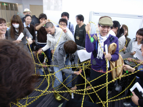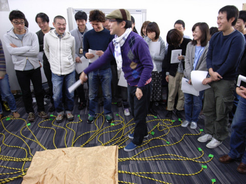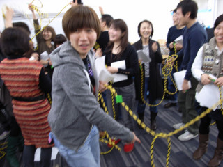 謎物件の使用方法。 弊社では、年に一度、その人がいままで何をやってきたのかを振り返るレポートを書くという行事ごとがあります。 このところ数年は、グループでおこなっていたことを、今年は、ペアで行おうということになりました。 グループですと、なにかとアイデアが盛り込まれて、デザインをするわ、ロケにでかけるわ、挙句の果てに、外注する事態となり、その沈静化を目的として、今回、ペアとなりました。 いわゆる「ゆりもどし」 というやつです。 ペアを作るに最適な方法は、やはり、ヒモのこっちとあっちを引っ張る、というやつではないでしょうか。 多分、40代以上の方々は、よくご存知のあの、れいの、プロポーズ大作戦ですよ。 あれ風のね。くじびきをね。 まあ、弊社、社内恋愛は禁止されているので、このヒモが恋に結びつくようなことはないとされていますが。 発案者は永田。 「乗った!」と叫んだこの行事ごとの担当の趙さん。 製作はぐっさんに依頼をし、司会はもちろん山下さんで執り行なわれました。 50人が一斉にヒモを引きますからね。 そのカオスぶりは写真のとおりです。 しかしながら、見事にペアができあがりまして、現在、今日退社までの締切りにむかって人々はカタカタカタとキーを叩いています。 2010/12/15 18:42 |