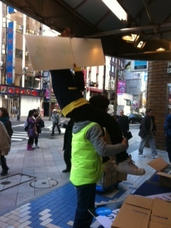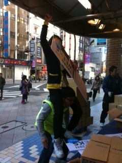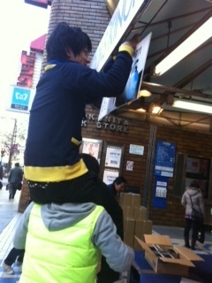 西本父さんの肩車にアルバイト小泉が乗って看板をつけています。