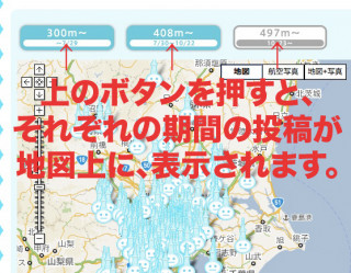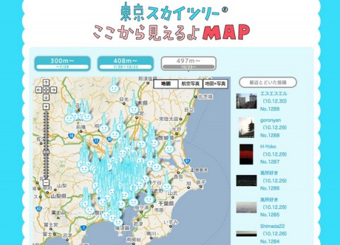 「ここから見えるよMAP」が見やすくなりました。 ほぼにちわ。 お正月を前に、 「東京スカイツリー ここから見えるよMAP」をプチ改定いたしましたのでそのお知らせでーす。 「東京スカイツリー ここから見えるよMAP」は東京スカイツリーを見かけたら、ぱちっと写真に撮って投稿してもらうコーナーです。 うれしいことに、すでに1200件を越える写真が集まり、地図上にぎっしりツリーマークが載るようになりました。 そして、あまりの多さに、だんだん見づらくなってきたため、 (1)次第にスカイツリーが高くなっていくのに合わせて、3つのMAPに分けました。 ・300m〜 (開始から7月29日までの投稿) ・408m〜 (7月30日〜10月22日までの投稿) ・497m〜 (10月23日から現在までの投稿) MAPの上の3つのボタンを押してもらうと、スカイツリーが高くなるにつれて、だんだん遠くから見えている様子がおわかりいただけると思います。 おためしください。 (2)「最近とどいた投稿」に 「前へ」「次へ」ボタンをつけました。 いままでは表示されている数件しか見ることができなかったのですが、これからは、さかのぼって投稿写真を見ることができます。 投稿した写真をいままでよりも見つけやすくなったかと思います。 お正月に東京スカイツリーを見かけたら、ぜひ、写真を撮ってお送りくださいね。 それでは、新年もよい年でありますように。 元気で、たのしい1年でありますように。 2010/12/31 11:00 |