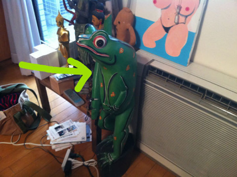 みうらさんのひっこし 我社もひっこししたてなのですが、 みうらじゅん事務所さんもひっこしをされました。 みうらさんのひっこしといえば気になるのがお荷物のみなさんです。 なにせ、量がね、 すごいですから。 特に、あの貝殻の船がみうらさんといっしょにひっこしをしたかどうかたいへん気になったので、さがしたところ、ありました。 涙出そうになりました。 それから、みうらさんがバリに行ったとき 初日に買ってしまったおかげでバリじゅうかかえて歩いたカエル、 いました! 葉っぱがバキッと折れたまま、いました! オールキャスト、あたりまえのようにみんなでひっこしです。 帰り際、天井からわざわざ器具をとりつけてまでぶらさがっているものを発見しました。 それは、ひょうたんでした。 2011/01/11 19:13 |