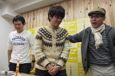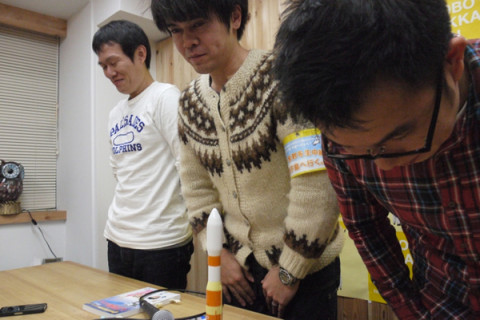 緊急記者会見風 さきほど、行われた奥野幹事長による緊急記者会見風UST中継テストですが、ご覧いただきましたでしょうか? 種子島チームである 記者たちもたくさん来ている風です。 ときには 3人それぞれに弁明したり、答弁したり、謝罪をしたり。 フラッシュがパシャパシャなっていてけっこう盛り上がっている風でした。 記者風から出る質問がちょっとつっこんだ方向にいきかけたときに 「はい、おいしまいです! おひきとりください」 という大きい声をあげて係風のひと( とにかく明日、種子島に向かうとのことです。 がんばれ3人。 今後についても、 こちらのページで報告されていきますので、どうぞご覧ください。 2011/01/19 20:13 |