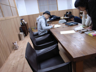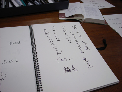 フライデー・イブニング。 それは金曜日のことじゃった。 夕方のことじゃった。 日は没していたかというとそれはどうだか忘れてしまったのじゃ。 我々は (問題がなければ、胸をゲンコツで たたきながら声にだして読むといいです。)、 「ブイヨンの気持ち。」の2冊目をつくっていて、その題字を社長にかいてもらおうとおもって、ペンと画用紙をもって、シゲ-Chang's roomを訪問した。 社長は、コツコツと画用紙に題字をかいてくれた。 そして、題字以外のことも書いてくれた。 ちょっと、書道についての話も語ってくれた。 2011/01/24 18:05 |
