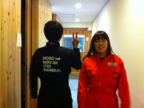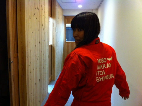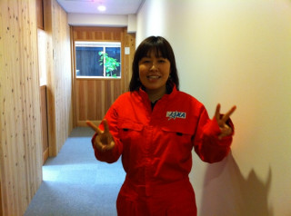 は、いつも女の子らしいファッションが多いんですけどね、今日は、JAXAさんのロゴ入りの作業服を着てごきげんです。