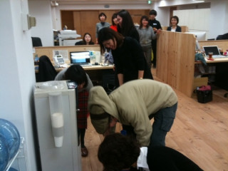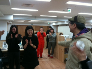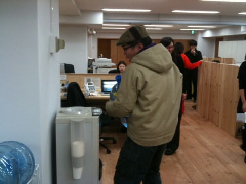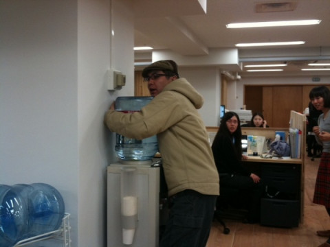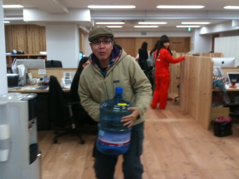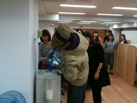 力持ちさん。 昨晩のことで恐縮ですが、ウォーターサーバーの水の出の調子が、どうもおかしい? ということで、みんなで様子を見ていたところ、一度、はずしたほうがいいんじゃない? ということで、ここはお父さんの出番です。 お父さん、腰に気をつけてね! 「まかしとけい!」 お、持ち上げて、 一旦、床に置いて、持ち直して。 そうこうしているうちに、ギャラリーが集まってきました。 よっこらしょ! 少し水がこぼれたものの、無事、再セット完了です! 最後は、スタンディングオーベーション。 おめでとう! ありがとう! 2011/01/28 15:10 |