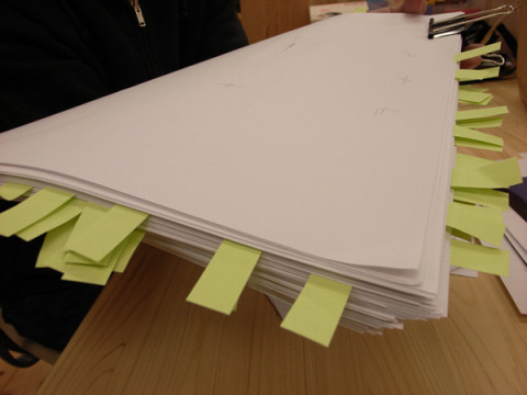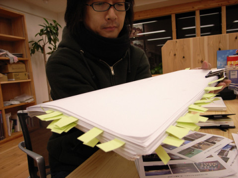 赤字の研究 朝出社してみたら、机の上に ・「羊どろぼう。」の刺繍。 ・カメラ。 ・「羊どろぼう。」他2冊の予定表。 の3つがおいてあった。 ワトソンくん。 これはつまり、昨晩、プリグラフィックスの清水さんがきて、なんらかの作業をしていった、ということに他ならないよ! 私こと、モーロック・ホームズは予想する。 カメラからカードをとりだし、読み込んでみると‥‥。 たいへん、渋い顔をした清水さんが大変渋い顔をして、付箋がびらびらとついたゲラをもって写っていた。 ワトソンくん。 これはつまり、犯人である編集者が、清水さんの持ってきたゲラに 「赤はいれればいれるほど、 本はよくなるんだからさ。」 というようなことをのたまいながら、縦横無尽に校正していった跡であろう。 凸ランドヤードのフジイレードくんにも連絡だ! 「すごい順調なんではなかろうか。」と。 ちょうど、いま読んでいる本がナニで。 ナニがナニしてみたけれど、最後が苦しい感じだな。 あと、モーロック先に帰っちゃってすみません。 2011/02/01 11:44 |
