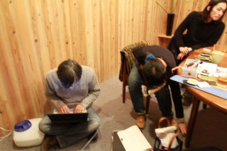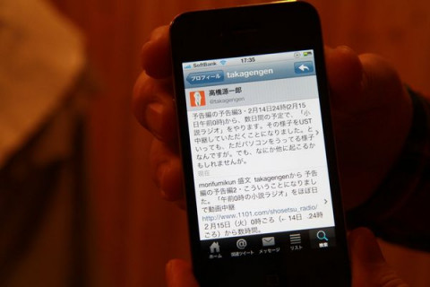 いきなりTwitter 高橋源一郎さん 「むーん、つながるようだねぇ」 「はい、よかったです」 高橋さん 「じゃ、ちょっと、 ここ、いい?」 ええええ? そ、そこに? 座るんですか? 「どうぞどうぞ」 椅子は、いいんですか、先生、椅子は、いいんですかー‥‥‥ そこから、連続の4投稿。 親指シフト恐るべし。 何をお書きになっていたかは 高橋源一郎さんのTwitterをごらんください。 本番は月曜深夜です。 「また、そのときに よろしく」 と言って、帰って行かれました。 よろしくお願いします。 14日深夜の「小説ラジオ中継」、詳細はこちらを。 2011/02/10 18:13 |