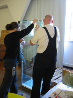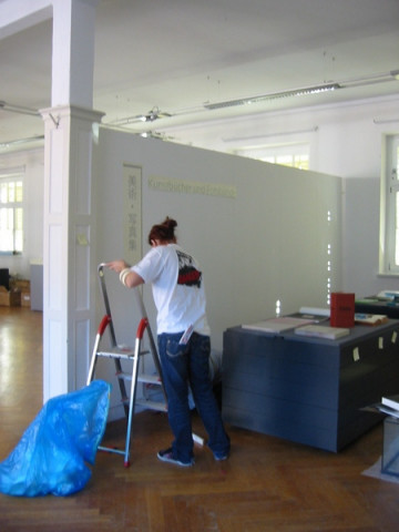 スタッフのかたが壁にポスターを貼ったりケースを移動させたり…お仕事していらっしゃいます。
