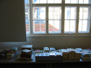 ケースの置き場所を決めつつ、本を並べているところみたいです。
