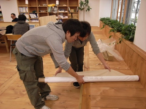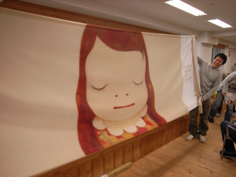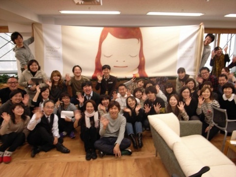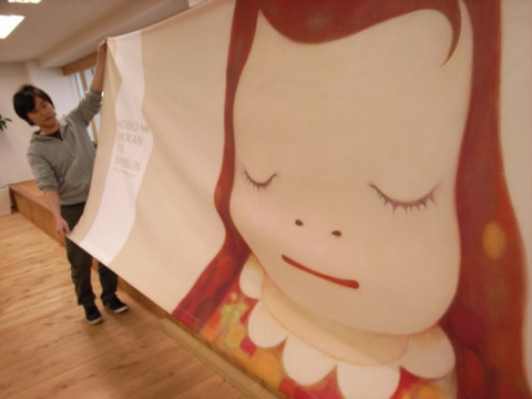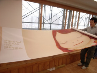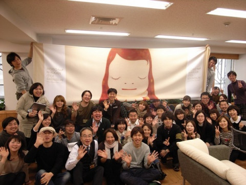 インパクト! なにやら、ぐっさんのところに長細い荷物が届きまして、西田くんとふたりでそれをくるくるくるっと、ほどきますっていうと、うわーーーーーー、すごい! なかから出てきたのは奈良美智さんの絵をプリントしたたいへん大きな幕。 「明日の栗コーダーカルテットさんの ライブでつかうんですよー」 ああ、なるほど、そりゃよさそう。 それにしても、すごいインパクト‥‥と思っていたら、案の定、 「うわー」「すごっ」「かわいー」 などと発しながら、乗組員たちがぞろぞろと集まってきました。 うーん、絵のちからってすごいなぁ。 さぁ、さぁ、とりあえず、意味はなくとも集まって、集まって。 はいはい、じゃあ、記念撮影ですよ! 小さいことばシリーズ最新作糸井重里の『羊どろぼう。』は明日2月22日(火)午前11時、注文受付スタートです! で、夜8時からは、『羊どろぼう。』のテーマ曲をつくってくださった 栗コーダーカルテットさんのライブを生中継いたしますーーー。 2011/02/21 16:32 |