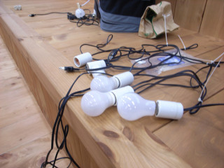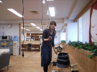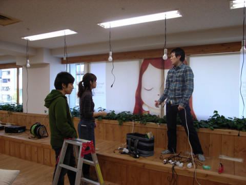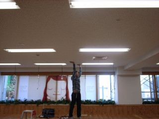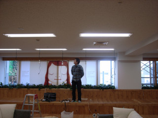 電球ぶらさがりました。 さて、こちら会場。 山口工務店は、照明のとりつけです。 棟梁の山口は、大学の照明学科というところを卒業しているそうです。 そして、アルバイトの芸大生、こざさも手伝いにきました。 本格的に動き出している証拠です。 ぐっさん、こざさにバリバリと指示をとばします。 そして、一人になったところで、なにか悩んでいる模様。 天井の素材を確認したり。 もうちょっとしたら、きっとばっちし解決していることでしょう。 ライブは20時から! 2011/02/22 15:01 |