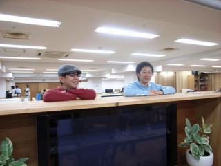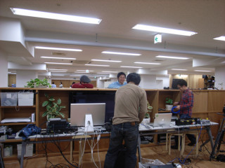 冷やかしおじさんズ。 設営はただいま、マイクテストの段階まで進んでいます。 「お、マイクテストっぽいぞ。」 そういって、永田さんと山下さんが歩いていきます。 どうよ? この「冷やかす気まんまん」の背中を。 猛烈設定中の宇宙部‥‥っていうか、しばらくみていないうちになんだか、機材がえらいことになってるけど? 「ほぼ弊社の自前です。 コツコツと増やしてきました。」 と、宇宙部(兄)はいいます。 おじさんたちは、冷やかしたのち、次のターゲットにむかいました。 2011/02/22 17:24 |