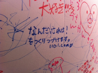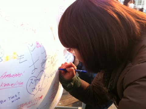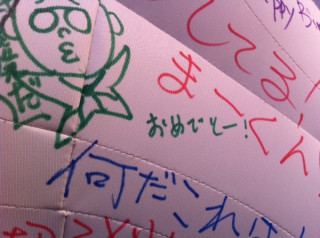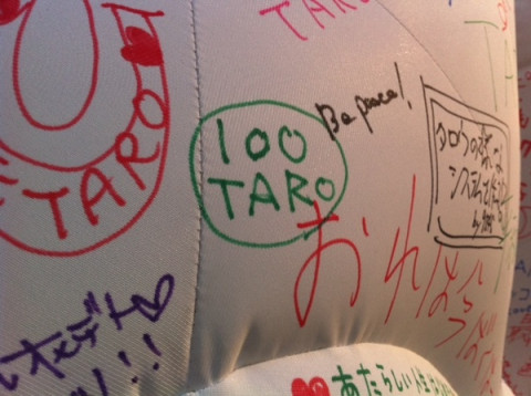みんなで、太郎さんの顔ミニ版にメッセージを書いて中継を終了とさせていただきます。