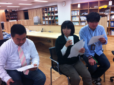 ワークショップ中継! さて、下見班は江古田という東京のとある町にいっておりますが、青山におります班員は、絶賛・WEBページ相談中でした。 「土曜日は、ワークショップ中継! いえ〜い!」 とても息があっているおふたりさんでした。 ところで、先日そのワークショップの係を「読み物」チームに説明をしたときにですよ。 その役割分担のリストをみながら、20分はいろいろ語ったね。 この人々は。 「受付のきれいどころっぷりは どうだ?」 「この、B班というのの 強力さはどうなんだ? だよ。」 などなど。 しかしながら、自分たちが 「テキスト中継」の役割であることについてのコメントはあまりなかった。 「まあ、道具と心構えだけ持って、 あとは、会場をみないと よくわからないし。」 しかし、 というところに自分の名前を発見し、驚愕をしていました。 「ねえねえ。なにも聞いてないよ。 ねえねえ。なにを話すの?」 大丈夫です。 いままでだって、大丈夫でしたし。 「いままでは、相方がいたんだけど。 今回いないんだけど。」 大丈夫ですって。 2011/03/02 15:47 |