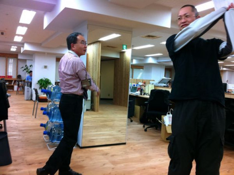 ゴルフ 我が社のゴルフ人口は少ないと思います。 以前、社員旅行に行ったときにゴルフをする機会があって、参加したほとんどが初心者で 「ほのぼのゴルフ」になったことがあります。 そんな「ほぼ日」にもブームが来たのだろうか、 「それで、まぁまぁだいじょうぶかな」 と、カサイが言っていたので、ベテランカサイによるアドバイスをオトヤがもらっていた、というひとコマだったようです。 しかし、今日のカサイは決まってますね。 水色のカフスが、ひゅ〜っ、おっしゃれ。 2011/03/03 16:39 |