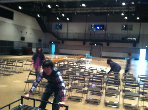 明日のお客さまをお迎えするためのいすを並べはじめました。