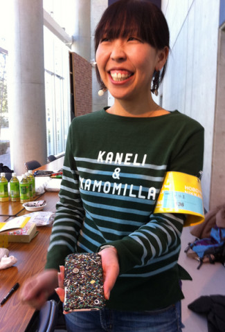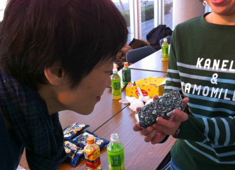 Gフォン? さっき、宇宙部がふり返っていた、 「ワークショップ@日藝」 でのできごと。 開場前の控え室で、携帯電話は置いておこうという話しをしていたところ、ジェニー そ、それは、iPhone? 「はい!持っていたネックレス をバラバラに分解して、 工具箱をひっくり返して、 中にあったいろんなものを ボンドでくっつけて、 2日間かけてデコりました。」 す、すてきだね!携帯もなかなか、フォトジェニックだね。 すると、横にいた 「うわあー、めっちゃいいー! わたしのにもデコってほしいー」 「やったー、これのよさをわかって くれる人が、やっとあらわれたー!」 よかったね、ジェニー。 フジツボを連想してしまったことは、胸にしまっておくよ。 2011/03/08 15:29 |