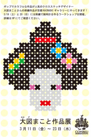 かいらしの逆襲 前回の「エピソード1」では、海外版の作品集で、アメリカ上陸を果たした、クロスステッチ・デザイナーの大図まこと氏。 今回の「エピソード2」は、舞台を京都にうつし、100点以上のかわいらしいクロスステッチをひっさげて、京都のギャラリー 「COHAKU KAIRASHI」にて、3月11日(金)から23日(水)まで作品展を開催中です。 KAIRASHI(かいらし)とは、京都弁で言う、かわいらしい、と言うこと。 手帳CLUBの特集でも大好評だった、かいらしいクロスステッチの世界を存分に見ていただけます。 (「ほぼ日のクロスステッチ」も 期間限定で展示販売しています) 予定していたことを予定通りに。 19日(土)と20日(日)は、ただいま大人気の『毛-SHOCK!!』のワークショップもされる予定です。 また、このKAIRASHIギャラリーでは、今回の東日本大地震の寄付のため、4月1日(金)から10日(日)までチャリティセールを開催されるとのことです。 くわしくは、ギャラリーのページをごらんくださいね。 週末、関西方面におられるかた、ナマ大図さんに会ってみたいかた、ぜひ、足をはこんでみてくださいね。 2011/03/18 20:00 |