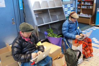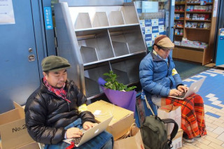 柱のかげ、とはいえ、天下の紀伊國屋書店本店入り口です。