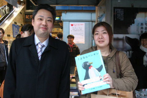 たまたま「さよならペンギン」を手にしたお客様がいらしたので、そこにいらした藤井さんと記念撮影。