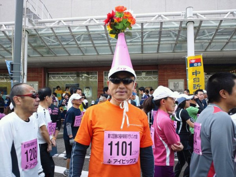 レースナンバー「1101」 ほぼ日手帳2011のカバー、 「レースメッシュ」の生地を作っていただいた、 八田経編の八田さんから 福井のマラソン大会(ハーフ)でレースナンバーがななんと「1101」でした。 ナンバーカードの右に 「.com」を書いて走ったことは申し上げるまでもありません。 少しでも明るい色を添えたいと思って、頭上にピンクのメガホンと造花をつけて走ってみました。 女子高生が自転車で追いかけてくるし、沿道の子供からゆびさされるし、ボランティアには騒がれるし、100人くらいに笑顔があったように思います。 北風が強くて抵抗ありましたけど、それにもまして、沿道の笑顔は励みになります。 というメールをいただきました。 ウフフ、八田さん、似あってますよ。 メールをひらいて思わず私も笑顔になってしまったのでご紹介させていただきました! (八田さん、ありがとうございました!) 2011/04/07 11:00 |