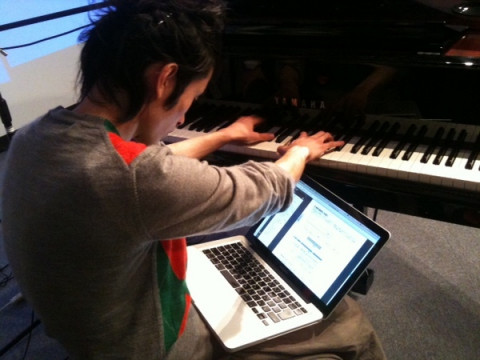高木さんが、インターネットで説明書を見ながら調律をされています。