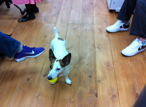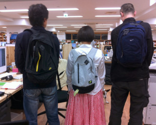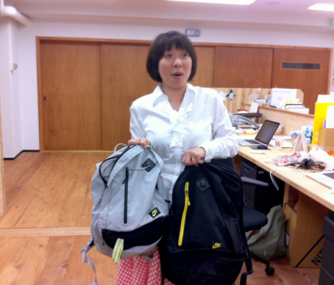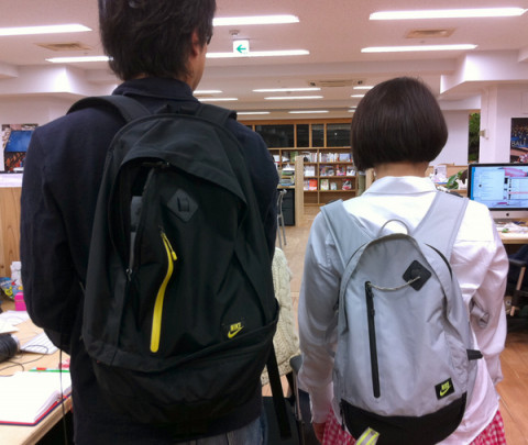 帰ろうとしていた 「うわ!席も隣り同士で、 リュックも一緒や!」 ふたりは今日、色違いのおそろいのナイキのリュックを持ってきていたのでした。 お互いに、私は空港で買ったとか、おれは原宿の店で買ったとか、このリュックのすばらしさをしばし語り合っていたら、横にいた、となりの島の 「あ、おれもナイキのリュックっす!」 と飛び入り参加! せっかくなので、早速、3人で記念写真をぱちり。 すると、その様子をじっと見ていたブイちゃん、みんなの足下のほうまでやってきて、 リュックで盛り上がってるけど、この人たち、スニーカーもナイキだよ、と、さりげなく教えてくれました。 ありがとう、ブイちゃん。 2011/04/20 21:36 |