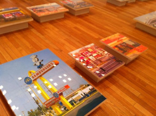 さきほどのマウンテンライオンの写真の壁から振り返ると、床にはいろんな場所のハンバーガー屋さんの写真がありました。