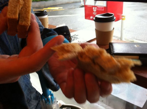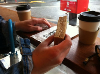 コーヒーブレイク PAPIER LABO.さんでもものすごくじっくりお話を聞いてしまったので、もうまったく時間がありません。 でも伊藤総研さんが 「おいしいコーヒー屋さんが あるんですよー」 とのん気におっしゃるので立ち寄りました。 たしかに、おいしかった。 中継でテンパっていたわたくしもここで日常を取り戻しました。 さらに 「このサンドイッチもおいしいんですよ。 モカサンドなんですけどね、 はんぶんこしませんか?」 とさわやかに提案してくださいました。 その、ちいさな、サンドイッチ伯爵が食べるようなサンドイッチいっこを、ですか? と迷っているあいだにとても怖く2等分してくださったので遠慮なく頂戴しました。 これも、おいしかったです。 さすがブルータスのカルチャーページ担当。 もっと教えてください、私に東京を。 2011/05/12 17:11 |