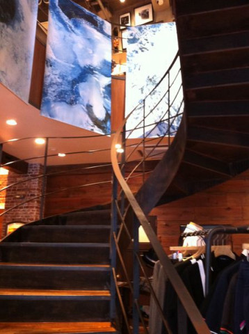 入口から見上げるとそこには、ホンマさんの作品が刷られたタペストリーがずらーっと。