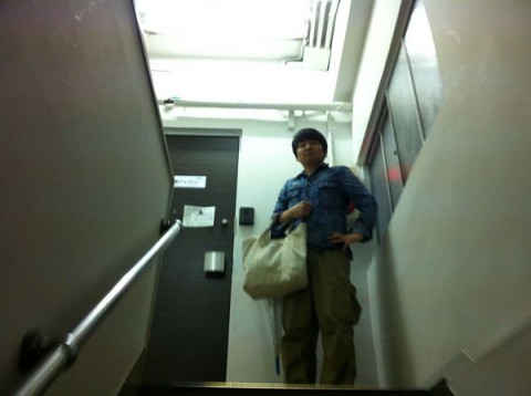 踊り場で「早くせえ」と総研師匠が待っています。