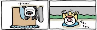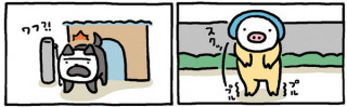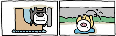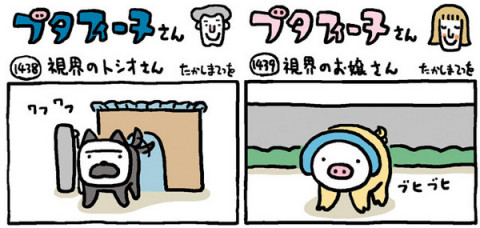 謎解きブタフィーヌさん 連載1440回、たかしまてつをさんの 「ブタフィーヌさん」。 さくじつ、読者のかたからこんなメールをいただきました。 芸が細かい! 今日のを見たあと昨日のをみたら、2コマ目の視点が少し上がってまする〜。 トシオさんのポールに注目! 毎日楽しみにしています。 2コマ目の視点‥‥?! そうなんです、1438話と、1439話のふたつのおはなしは、セットだったのですよ! 1コマずつ、左右で並べてみたので見比べてみてくださいな。 1438話は、ブタフィーヌさんから見たトシオさんのようす。 1439話は、トシオさんから見たブタフィーヌさんのすがた。 たしかに、2コマめのトシオさん、屋根の見える部分とポールの見える角度が微妙に変わってます! ところで作者のたかしまさんの個展「あの空まで歩こう」は来週水曜日、18日まで開催中。 ブタフィーヌさんとおなじくらいたのしい遊びが満載ですよー。 どうぞ足をはこんでくださいねー。 2011/05/13 11:55 |